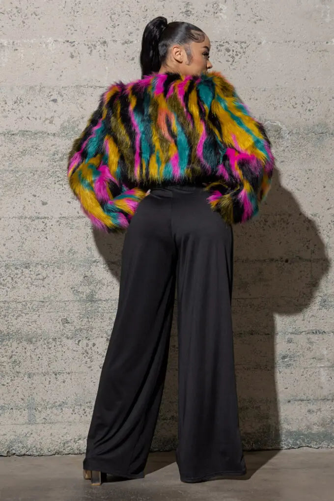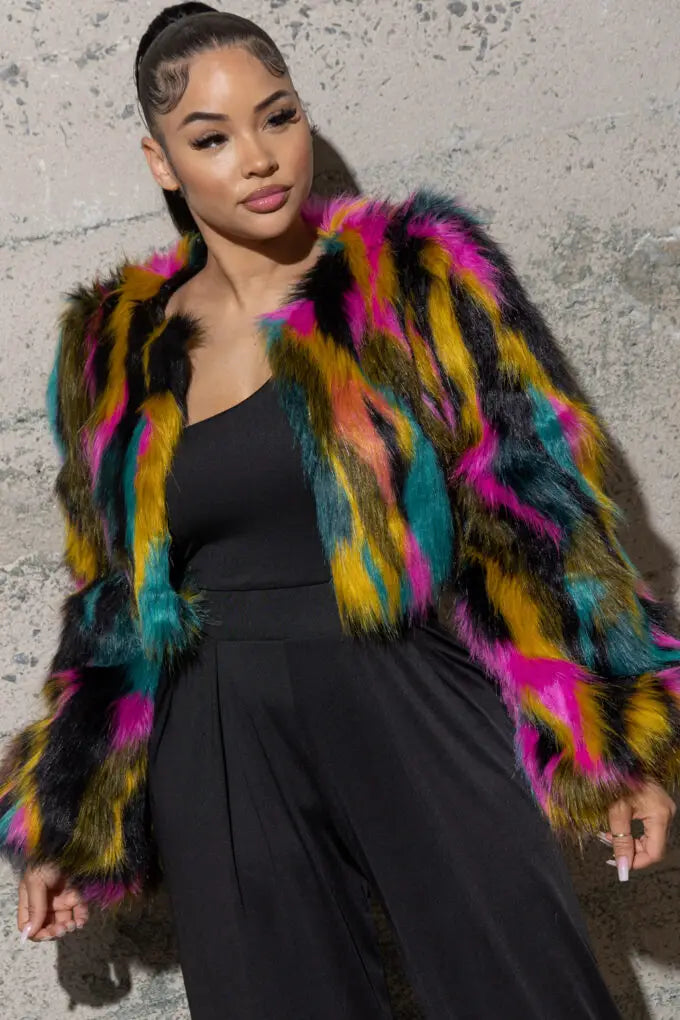 Indulge in luxurious warmth with FURRR, our colorful, multi-color faux fury jacket. Stay stylish and cozy while braving the cold, without harming animals. Made to perfection with high-quality materials and detailed craftsmanship for a timeless addition to your wardrobe.