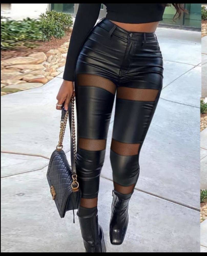 FAUX LEATHER MATERIAL AND SHEER LEGGINGS.
